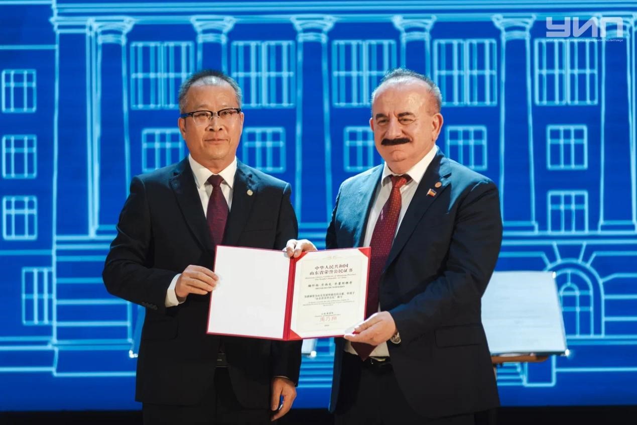 李贞涛代为转交山东省人民政府授予顿河国立技术大学校长、我校中俄博士联合培养基地导师梅什西·贝西克“荣誉公民”证书,表彰其为推动中俄教育交流与地方合作所作出的杰出努力。