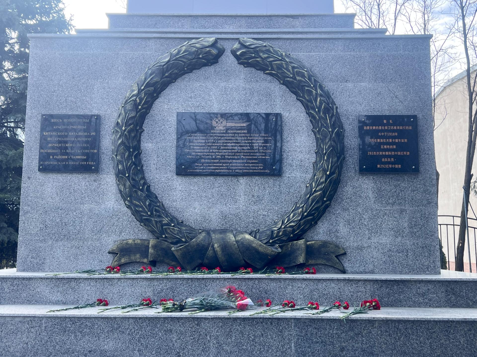 据悉,十月革命爆发后,大批在俄华工投身俄国无产阶级革命,接受革命思想,加入红军队伍,为十月社会主义革命的胜利和世界上第一个社会主义国家的诞生作出了贡献。原苏联境内建有多处中国烈士纪念设施,目前在俄罗斯境内经中国驻俄大使馆考证的共有7处,莫罗佐夫斯克市中国志愿者纪念碑即为其中之一。莫罗佐夫斯克市中国志愿者纪念碑呈方尖型,顶端缀有一颗红星,正面用中俄双语镌刻着:“敬礼,这里安葬的是在保卫苏维埃政权的战斗中于1919年7月在莫洛佐夫斯卡娅车站地区牺牲的第292杰尔宾特国际团中国红军游击队队员。”